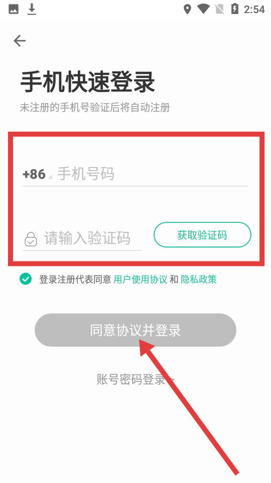 2、在手机快速登录页面中,输入手机号并获取验证码填入,然后点击同意协议并登陆。