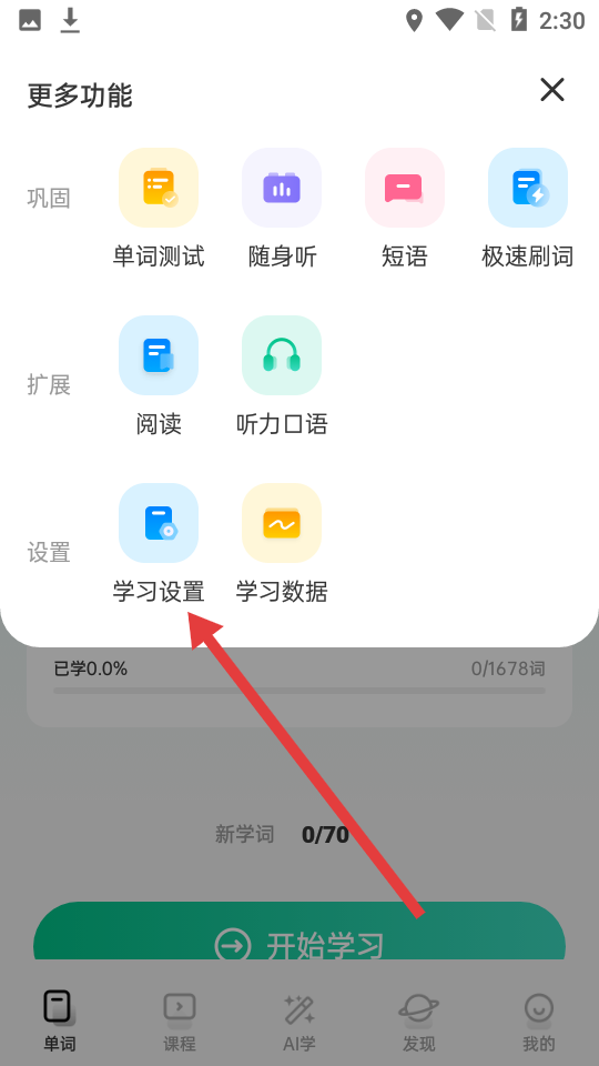3、进入学习设置,点击单词书旁换书按钮,即可成功换单词书。