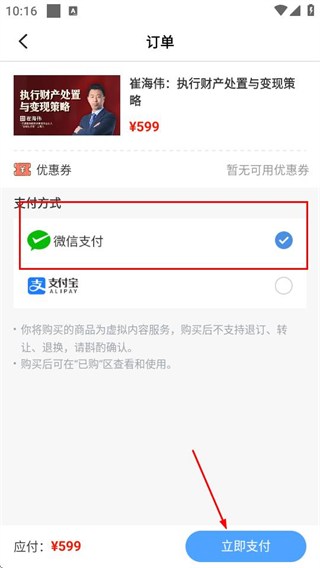 5、在订单支付页面,选择支付方式后点击立即支付,完成课程购买流程。
