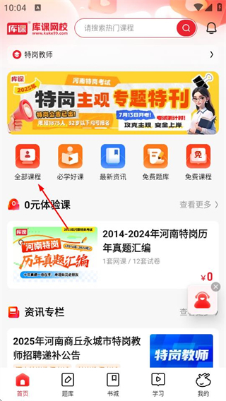 1、在库课网校首页,点击全部课程选项,进入课程列表页面。