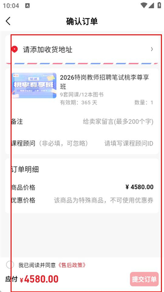 4、添加收货地址,勾选协议后点击提交订单,完成购买流程。