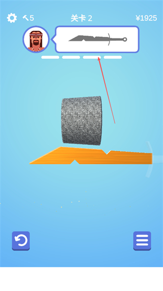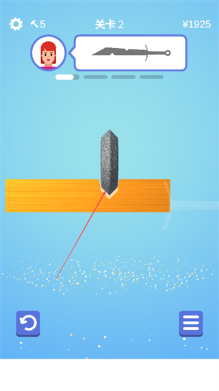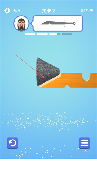1、在关卡2中,根据上方剑的形状提示,操控砂轮对准橙色木块的缺口,开始打磨塑形。