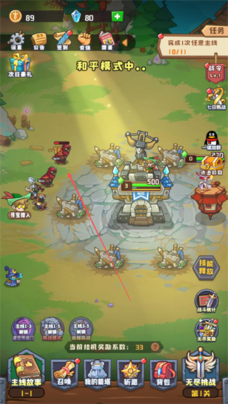 4、布置多种防御塔,利用主线故事、召唤等功能强化防御,在和平模式中积累资源,持续抵御敌人。