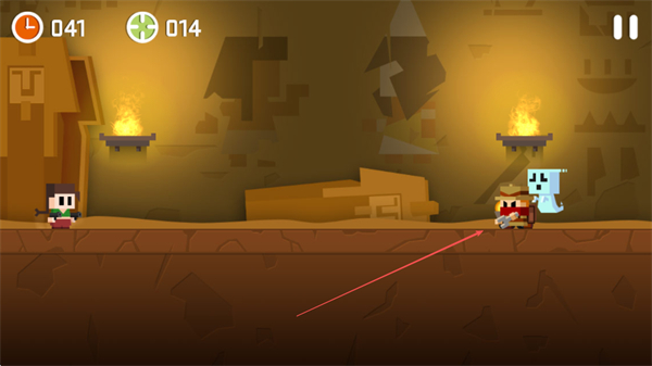 古墓英雄无限钻石是一款盗墓题材的动作作品,采用复古像素风格与横版2D画面呈现,角色及墓室怪物均为方块造型,背景色彩偏黑暗,搭配泛黄火光营造出恐怖墓穴氛围,操作采用触屏操控,手指点击屏幕左右两边即可控制主角射击,需注意射击方向与点击方向一致,但主角身体会向反方向跳跃,在惊险的墓室探索中展现动作操作的独特乐趣。