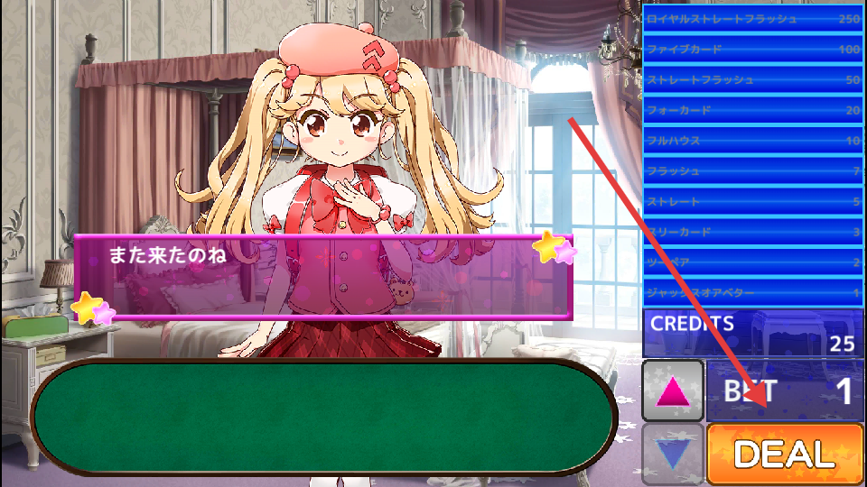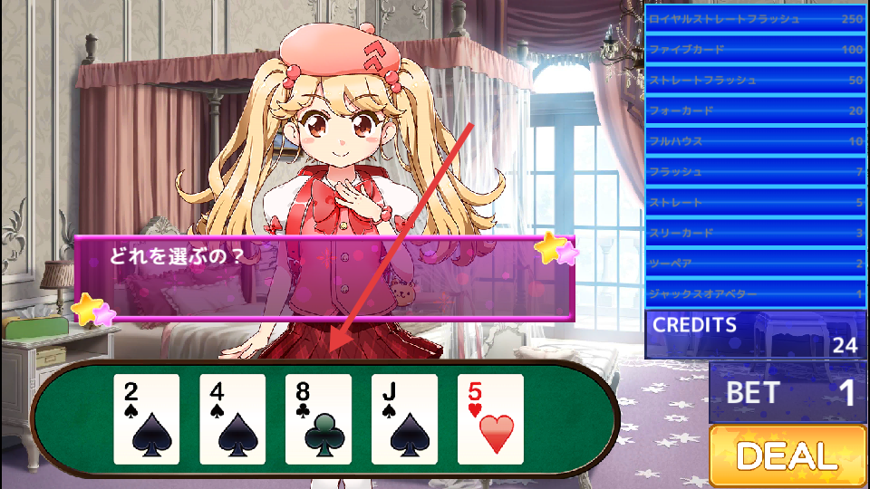 1、基础牌局:系统自动发五张牌,点击保留想留的牌,换牌后与妹妹比大小定胜负。赢牌时会累积好感度计量表,集满后下一局必定出现互动动画。