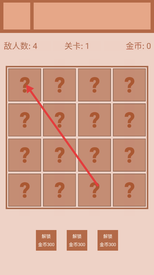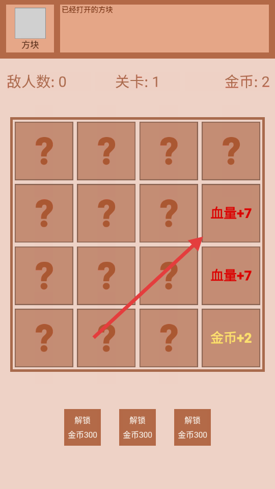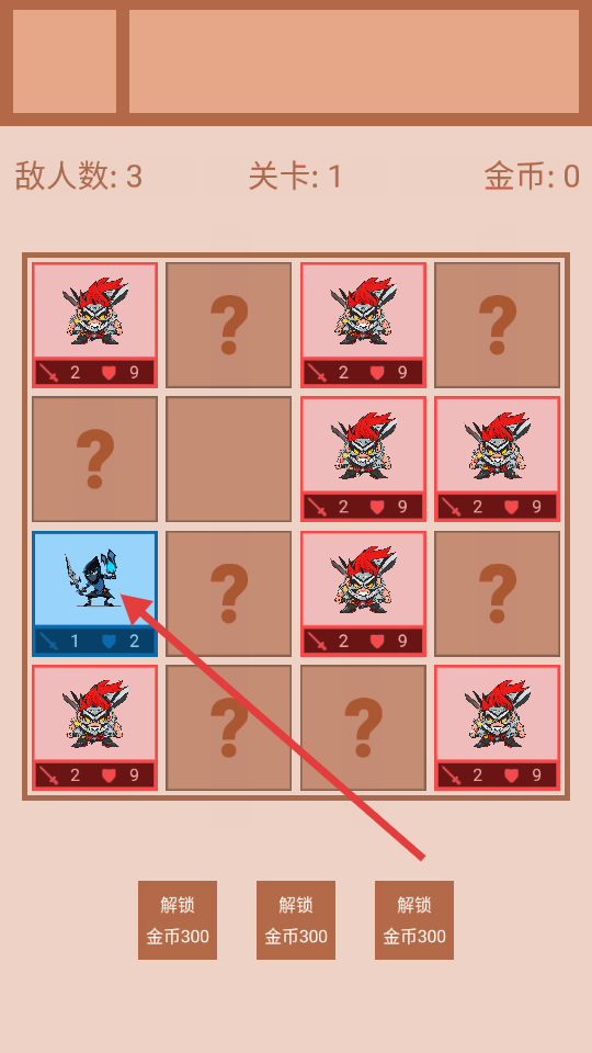 1、点击问号格子随机翻牌,红色英雄加入队伍蓝色怪物触发战斗。