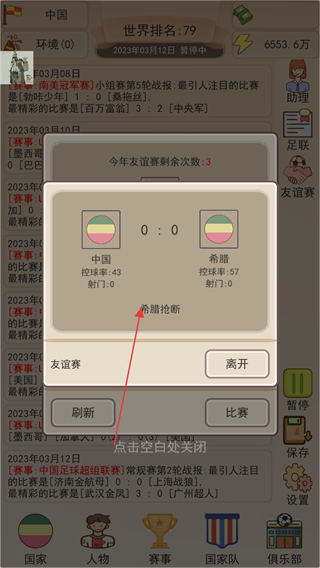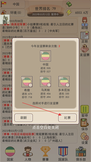 2、进入友谊赛界面,选择对手如希腊,点击比赛按钮,开启友谊赛。