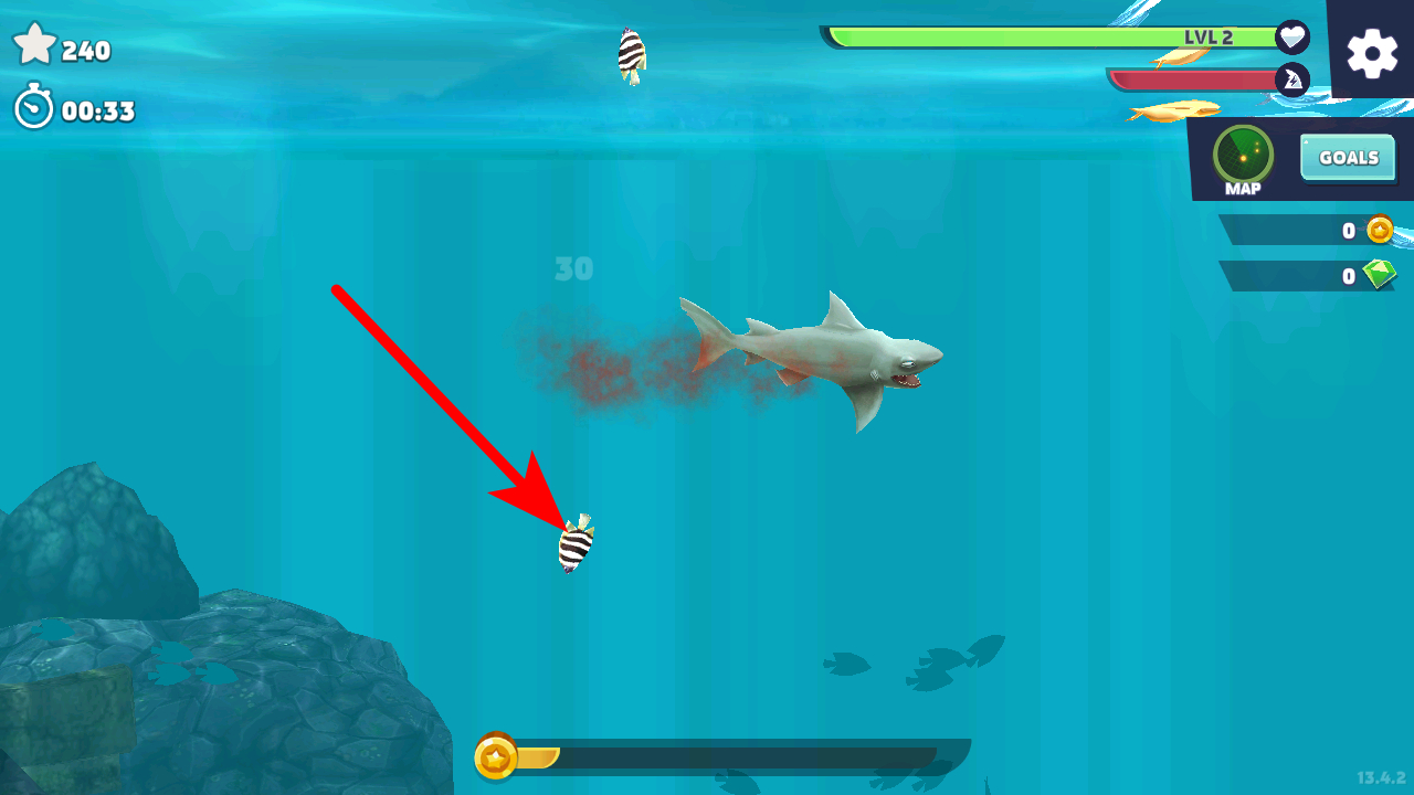 3、在海洋中寻找各种鱼类、海洋生物等进行捕食,获取分数和经验。