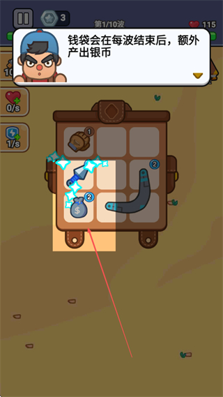 1、放置钱袋道具,每波结束后额外产出银币,积累资源。