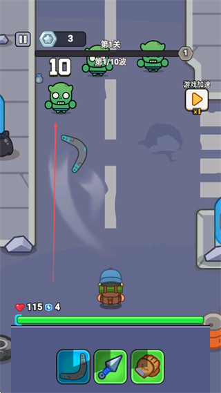 2、使用弯曲武器攻击绿色僵尸,削减其数量,抵御进攻。