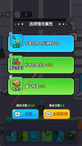 4、选择强化属性如所有防具生命+5%,增强自身战力,顺利通关。