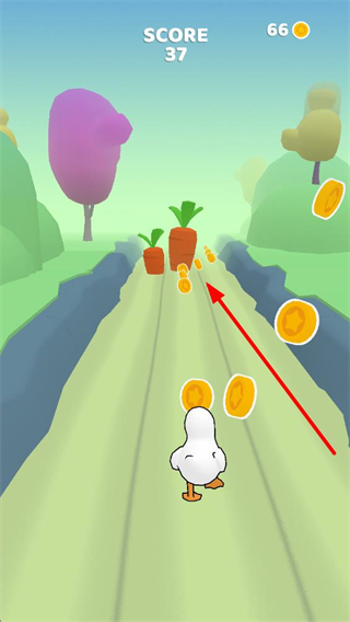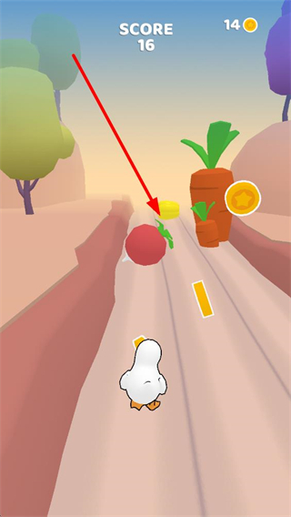2、奔跑过程中点击屏幕左右区域可控制鸭子左右、下蹲、跳跃,躲避道路中间或两侧的障碍物,如木栅栏、施工路障等。