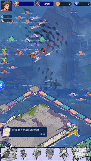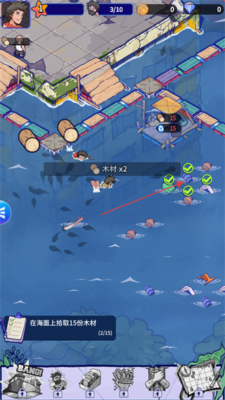 1、点击海面上的木板水桶等物资,打上对勾的是可以获取到的物资。