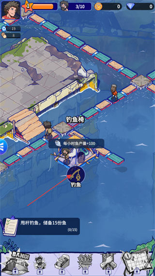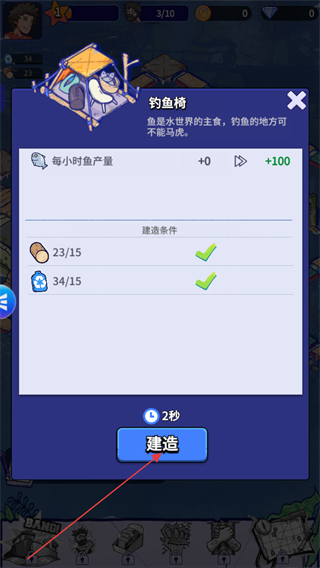 4、在新建的钓鱼椅上点击钓鱼按钮进行甩杆获取食物来源。