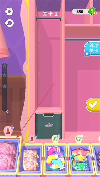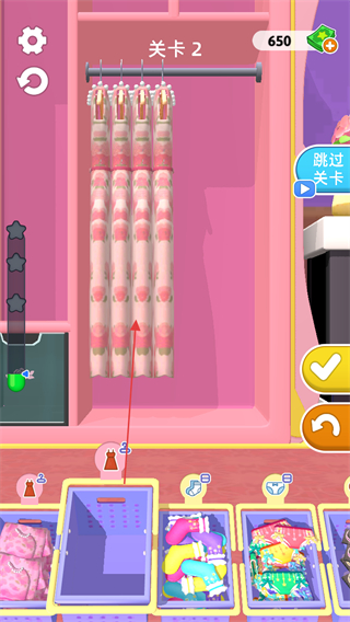 4、继续整理剩余衣物如内衣,全部整理完毕后,点击下一关进入新关卡。