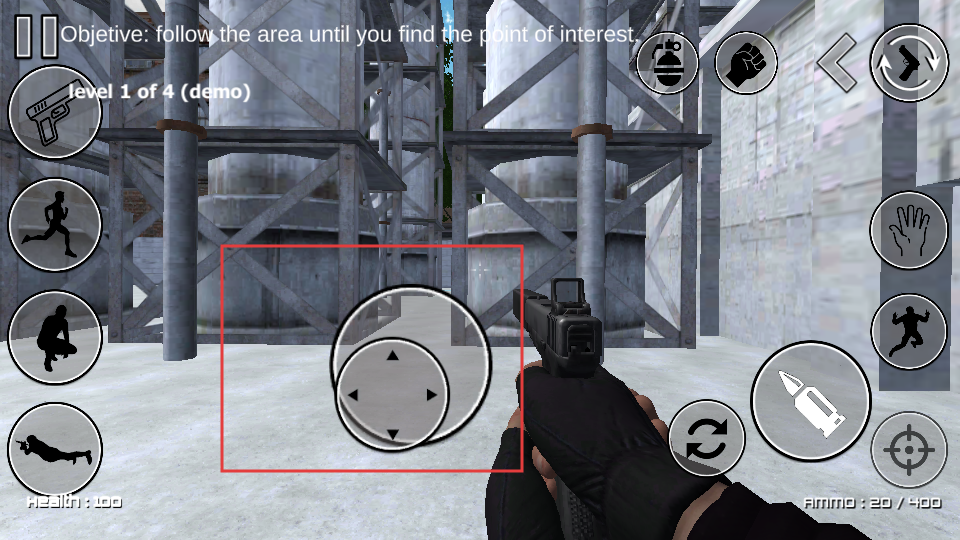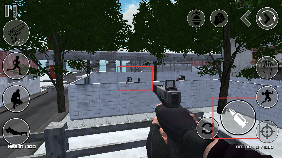 4、遇到敌人时,可使用右侧的武器按钮进行射击,注意观察敌人位置,利用场景中的掩体躲避攻击。