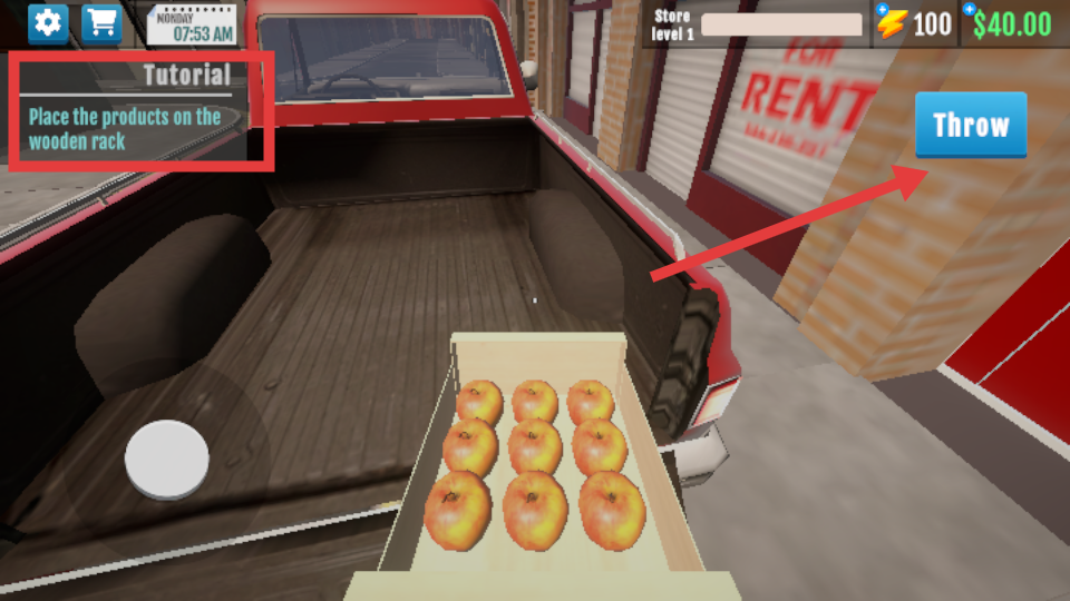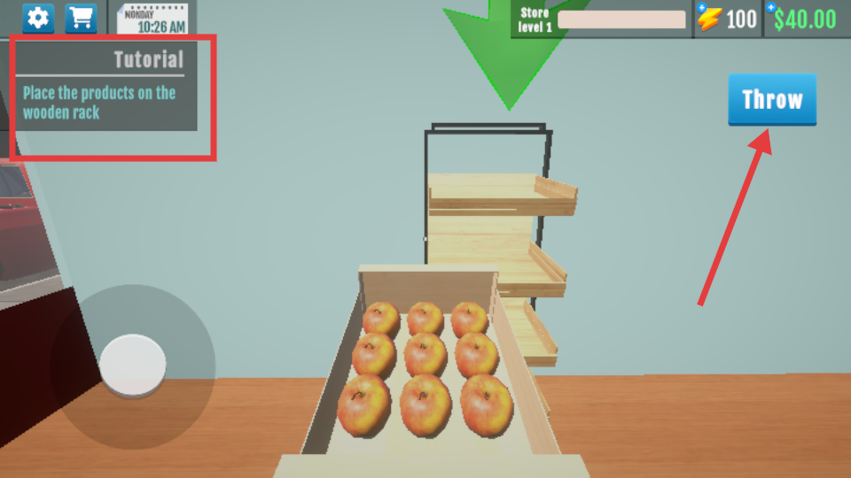 2、到达木架位置后,点击“THROW”按钮将商品放置在木架上。