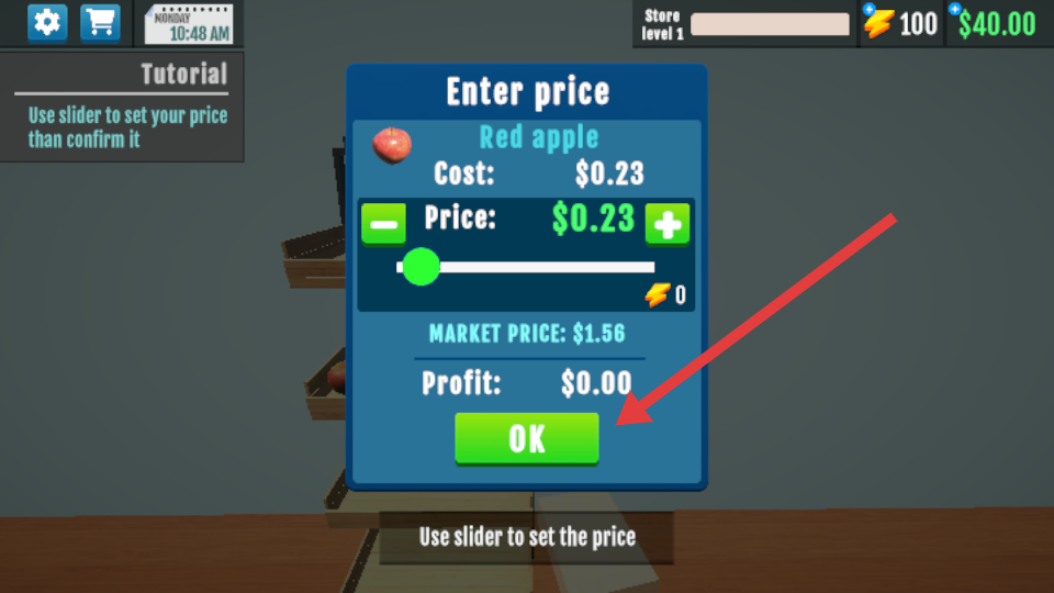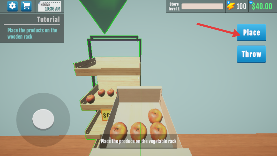1、根据教程提示“将商品放置在木架上”,点击按钮把苹果拿起来,将其运送至木架处。