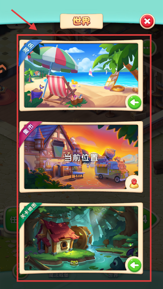 2、可选择【海岛】【集市】【关卡地图】等场景,切换游戏区域。