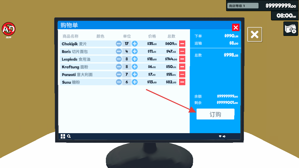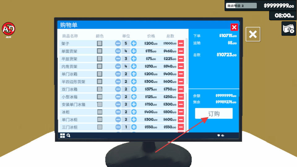 3、装修物品加入购物单后,在购物单界面确认数量和总价,点击“订购”按钮完成装修物品的采购。