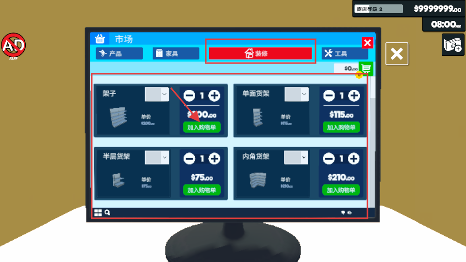 2、进入市场的“装修”板块,可选择架子、单面货架等装修物品,点击“加入购物单”,用于商店的装修升级。