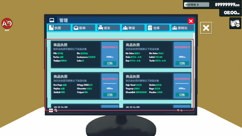 4、在管理界面的“执照”板块,可订购不同商品的执照,获取执照后可解锁对应商品的出售权限,丰富商店的商品种类,提升经营收益。