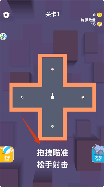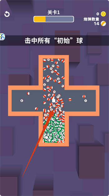 1、游戏开始时,熟悉【拖拽瞄准-松手射击】的操作方式,根据关卡1的布局,规划好射击方向,为击中目标球做准备。
