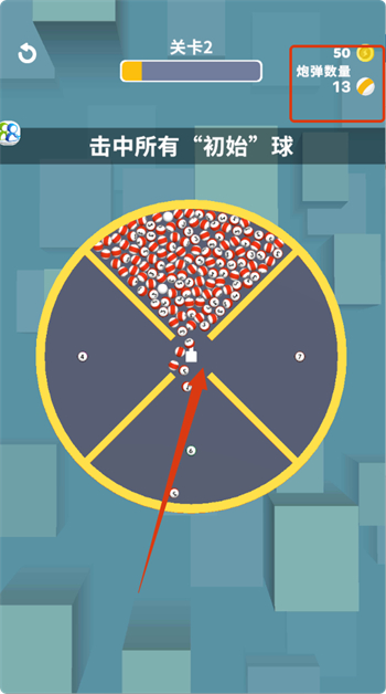 2、在关卡1中,按照提示击中所有“初始”球,注意炮弹数量变化,合理利用每一发炮弹,确保清空目标区域。