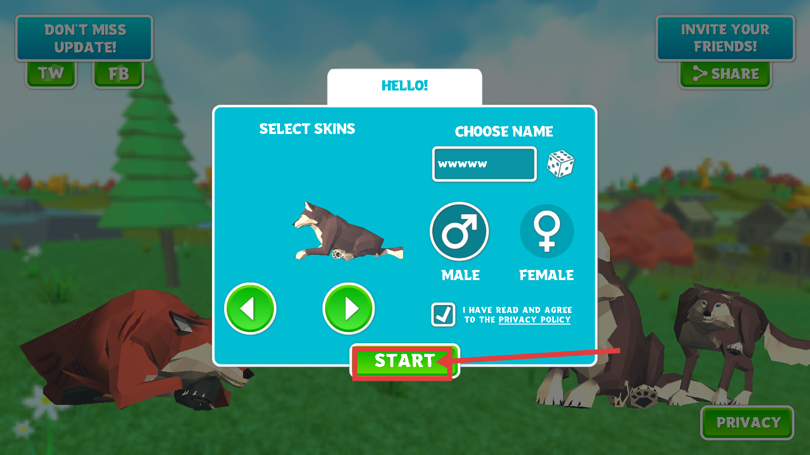 1、完成【皮肤-性别-名字】选择,勾选隐私政策后点击【START】,开启动物模拟游戏之旅。