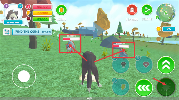 3、遇到【浣熊】等敌人时,点击技能按钮发起攻击,合理战斗可获取资源。