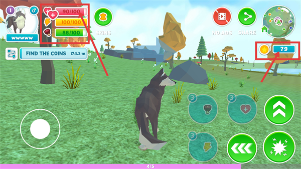 4、关注左上角【血量-能量】数值,保持状态良好,同时收集金币,积累到【79】可用于升级或解锁内容。