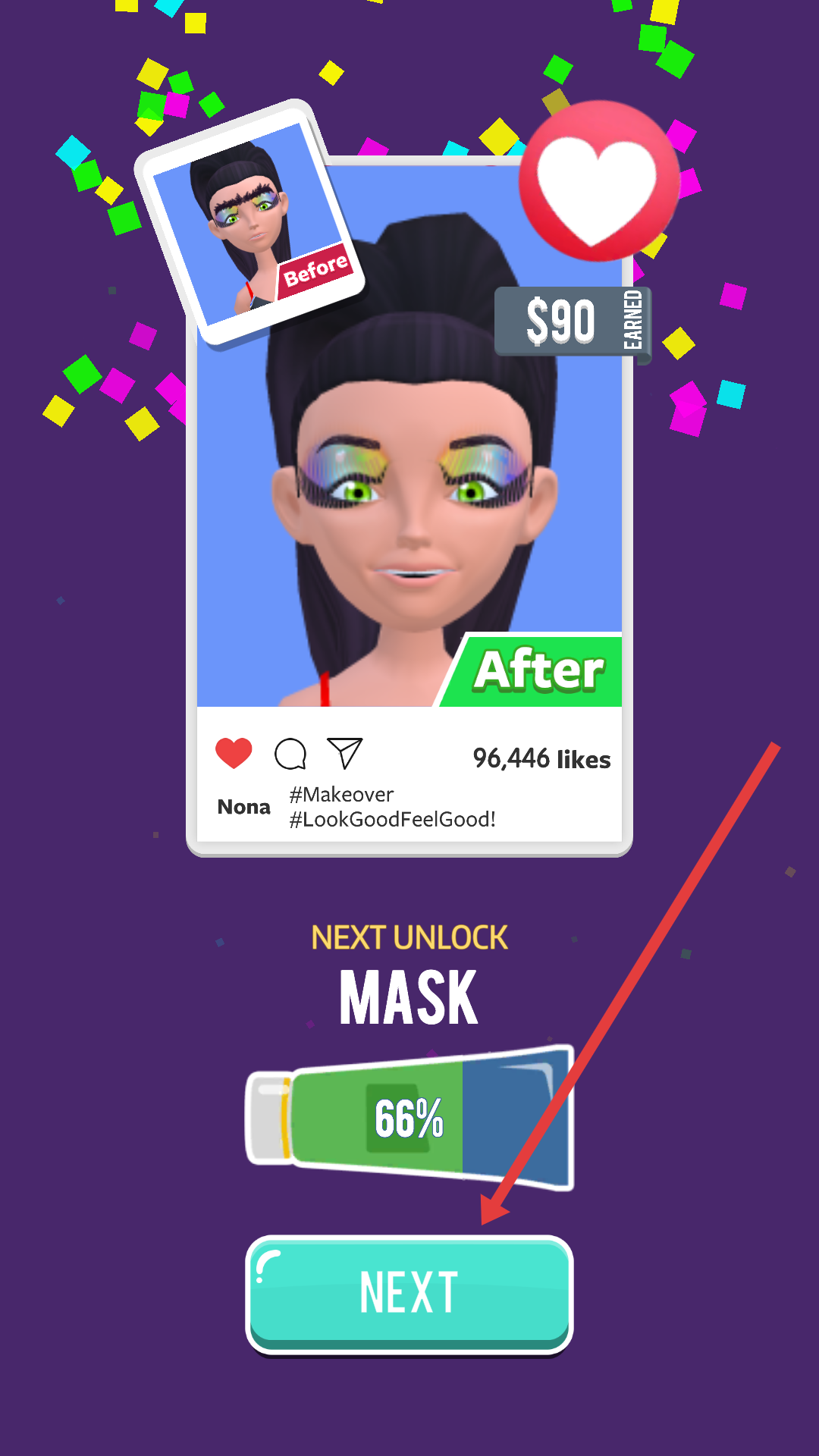 4、完成美妆后,界面会展示前后对比及收益,点击【NEXT】按钮可解锁新的美妆项目,继续体验更多美妆改造。