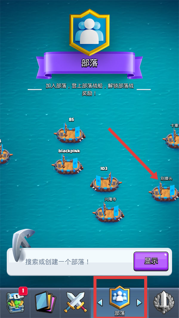 1、点击底部【部落】按钮,在部落列表中选择部落,加入后可解锁部落战奖励,还能和成员捐赠卡牌,助力卡组养成。