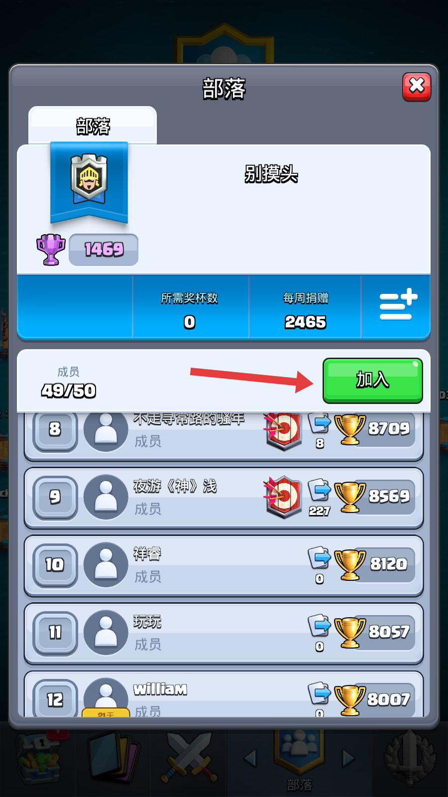 2、进入【别摸头】部落详情页,点击【加入】按钮即可加入,和部落成员提升部落等级,获取部落战奖励,增强卡组战力。