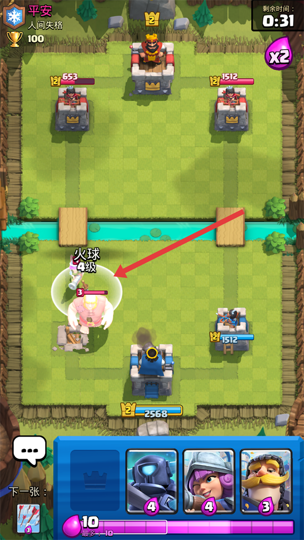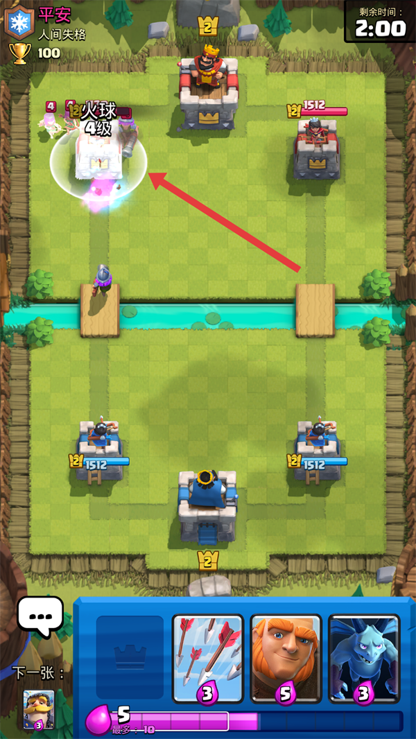 4、当敌方派出肉盾单位时,释放【火球】可有效削减其血量,配合其他卡牌解场,把控战局节奏。