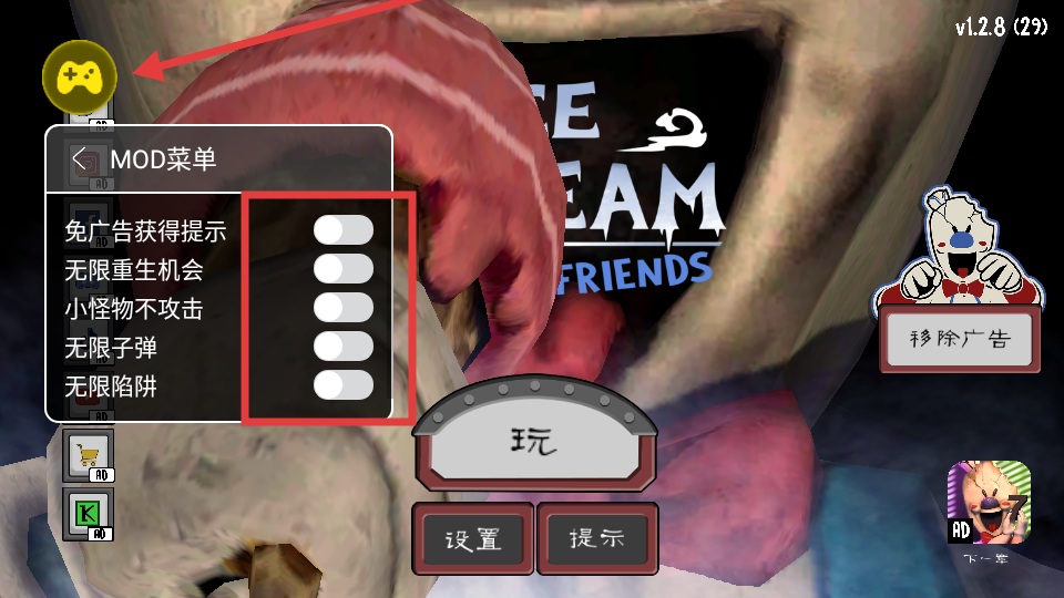 1、点击左上角的游戏手柄图标可打开MOD菜单,可根据需求开启免广告获得提示、无限重生机会等功能。
