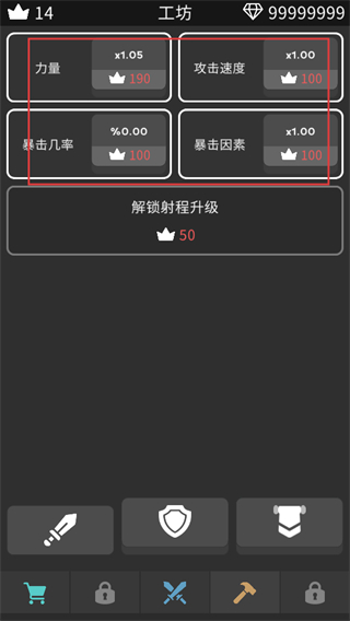 1、在工坊界面升级【力量】【攻击速度】【暴击几率】【暴击因素】等属性,利用皇冠资源提升单位战力,为战斗奠定基础。