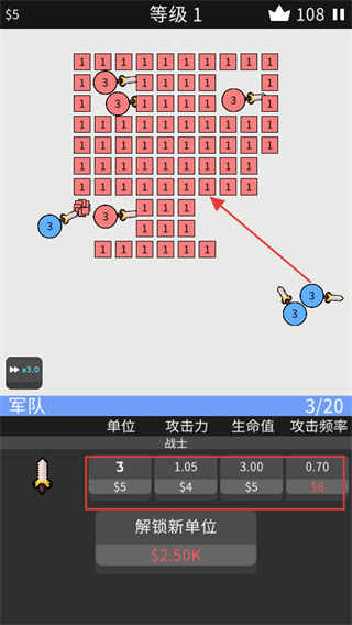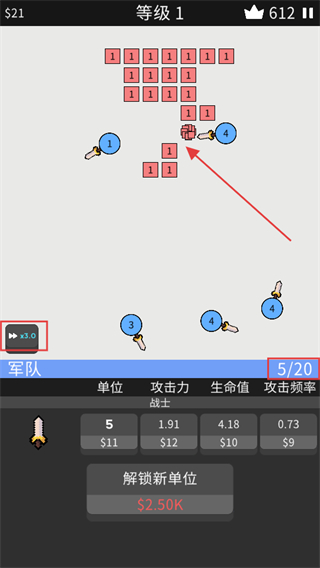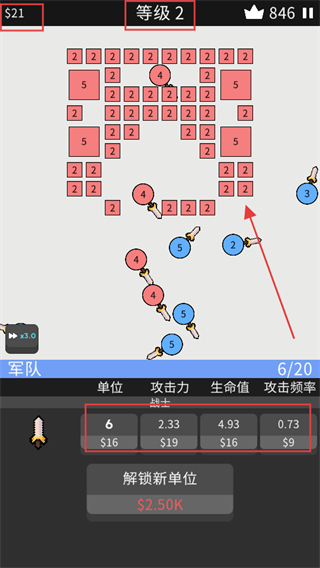 4、升级到等级2后,面对带有不同数字标识的敌人,合理分配军队单位,利用提升后的属性和单位数量,高效清理战场并推进关卡。