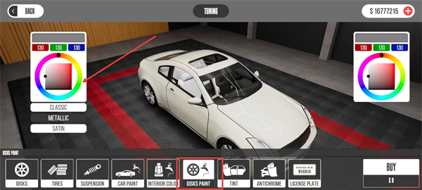 2、进入车辆改装界面,可选择轮毂喷漆等改装选项,通过左侧的颜色轮盘调整喷漆颜色,打造个性化车辆外观。