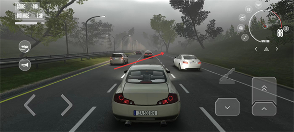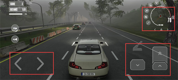 2、游戏中利用左侧的方向按钮控制车辆左右移动,右侧的加速和减速按钮控制车速,右上角的仪表盘显示车辆速度。