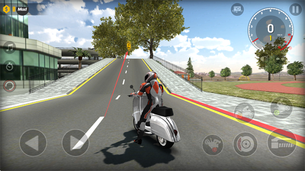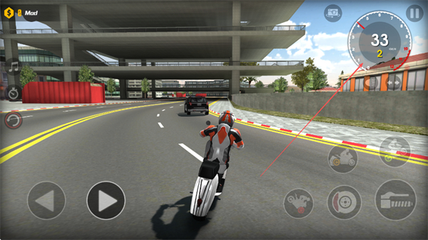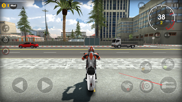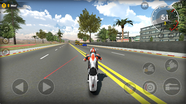 1、点击右侧加速按钮提升摩托车速度,在城市道路上行驶,注意躲避其他车辆。