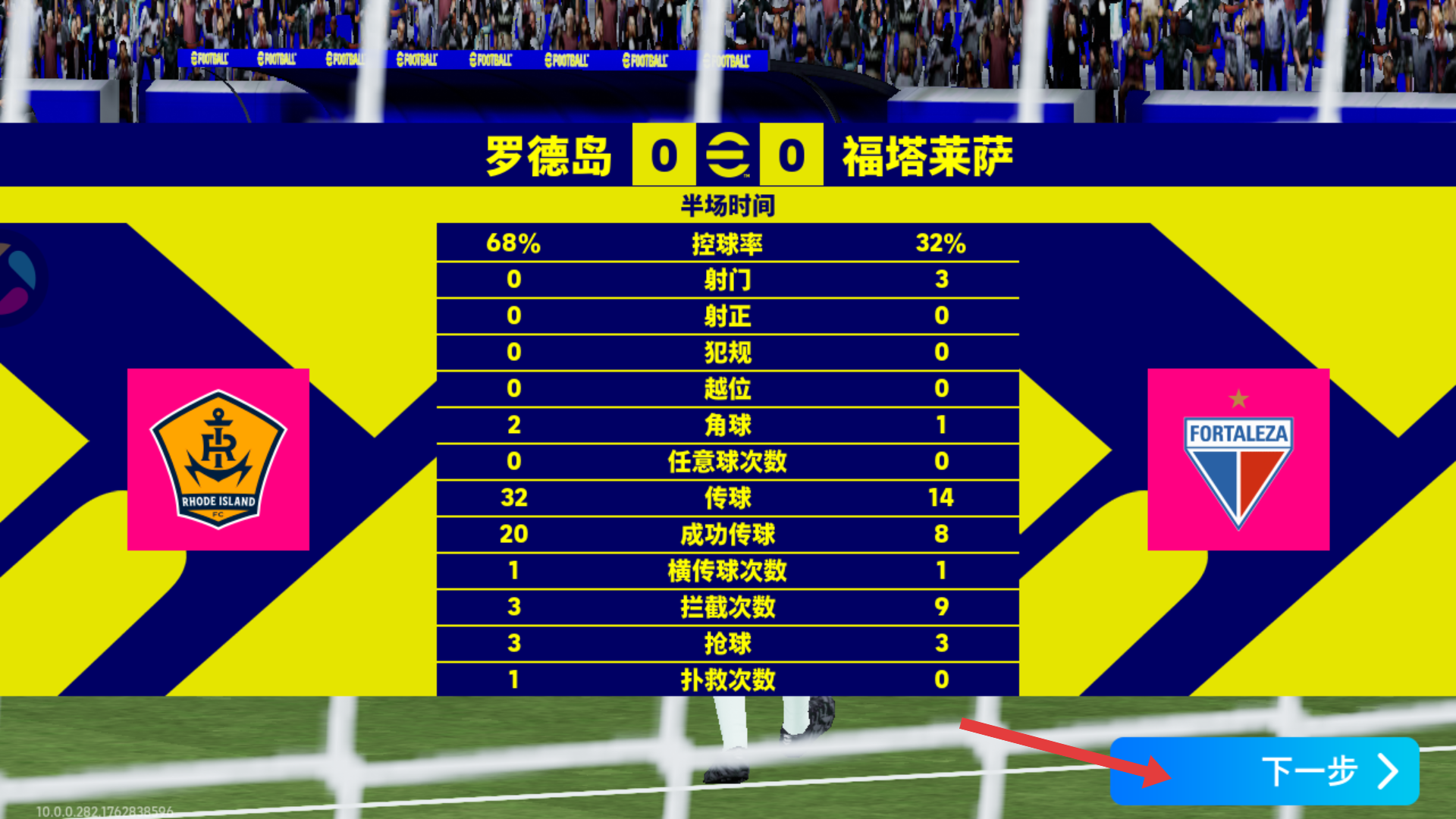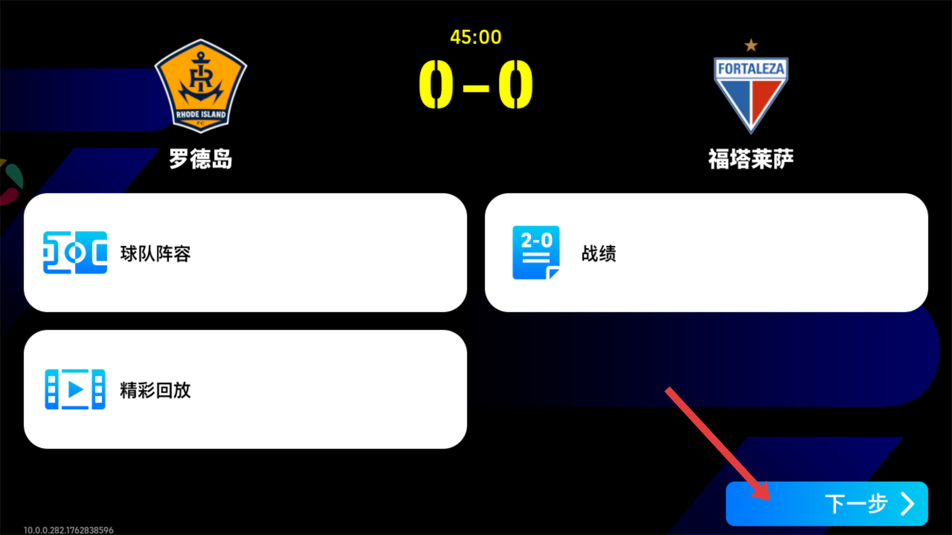 4、半场战罢,点击【下一步】,可查看球队阵容、战绩或精彩回放,全面复盘上半场比赛情况。