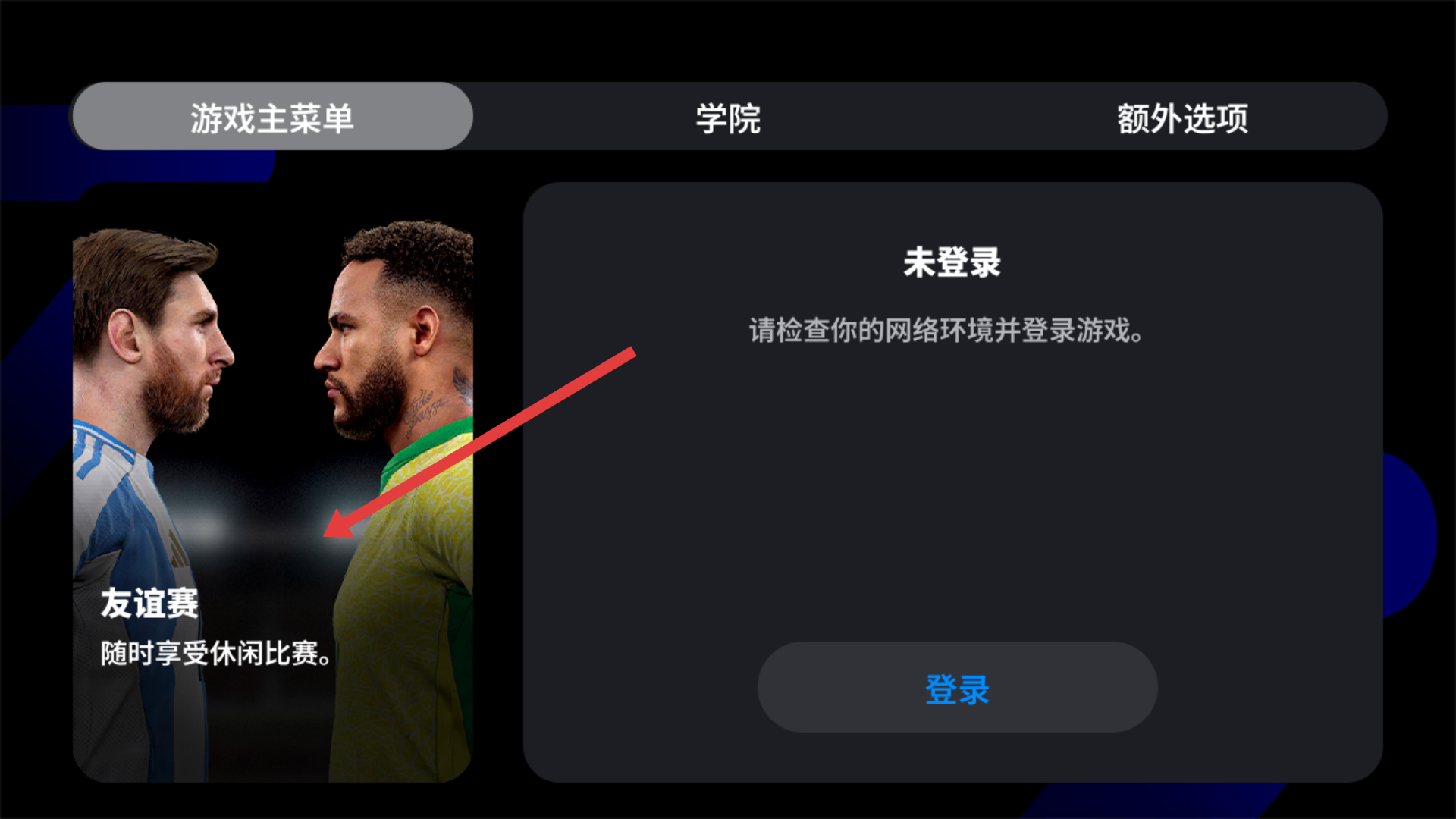1、进入游戏后,可选择【友谊赛】模式,随时开启休闲比赛,享受足球竞技的乐趣。