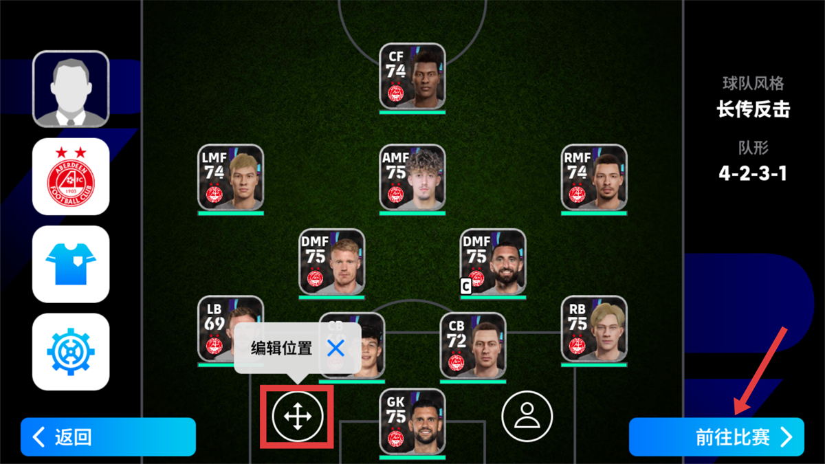 2、在球队编辑界面,利用【编辑位置】功能调整球员站位,搭配好阵容后点击【前往比赛】,开启精彩对决。
