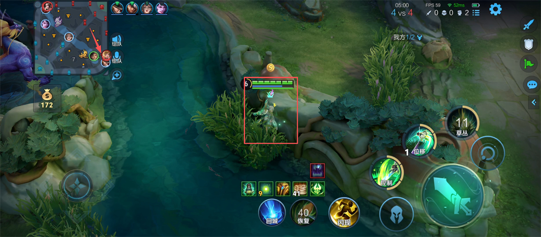 4、队友压塔太深时,去占住必经之路的【草丛】,能第一时间发现敌方援助,给队友妥妥的保障哦。