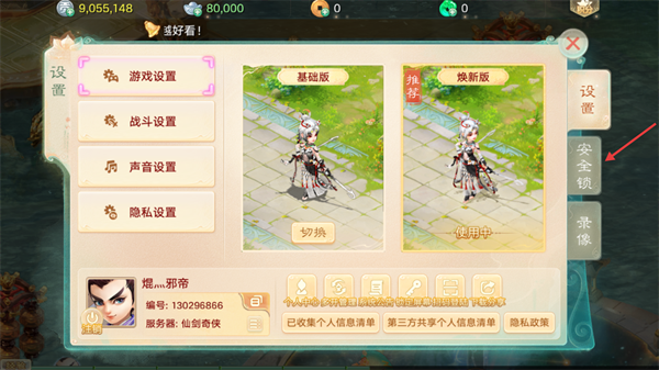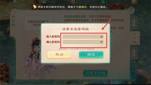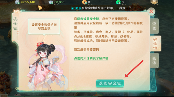 3、点击【设置安全锁】,开启后可限制装备、召唤兽等操作,保障账号资源安全。