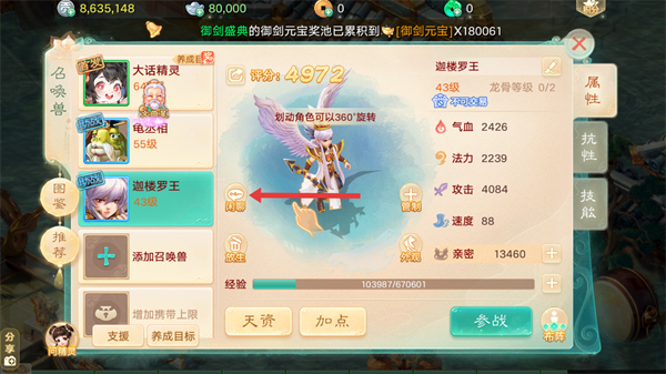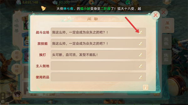 2、进入召唤兽界面,选择目标召唤兽,点击【闲聊】,进入闲聊设置界面。