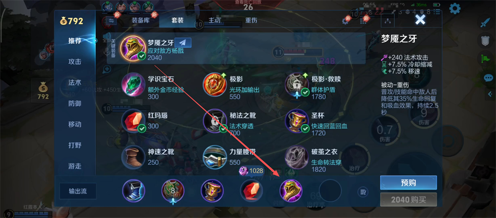 4、购买装备时,选择如【梦魇之牙】这类克制敌方的装备,针对敌方英雄属性,提升对战优势,拿下对局胜利吧。