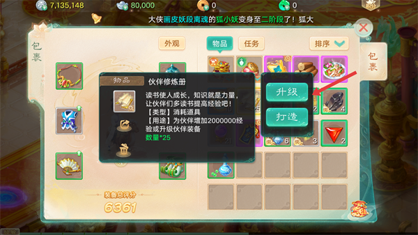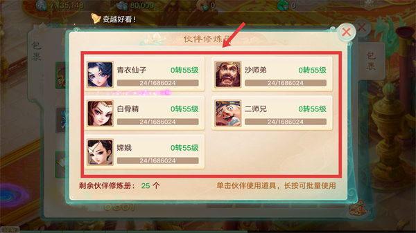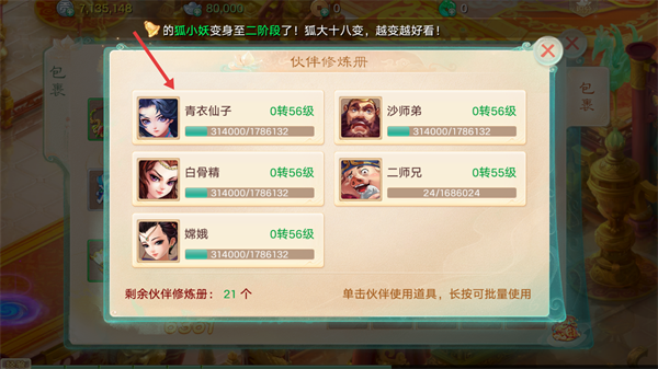 3、选择目标伙伴,使用【伙伴修炼册】,提升伙伴的经验和等级。