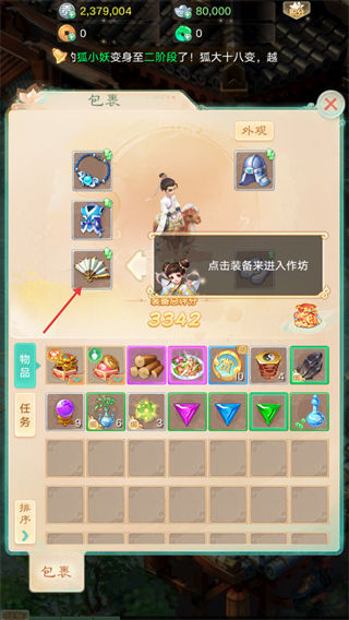 1、在游戏界面点击【包裹】,进入包裹界面。